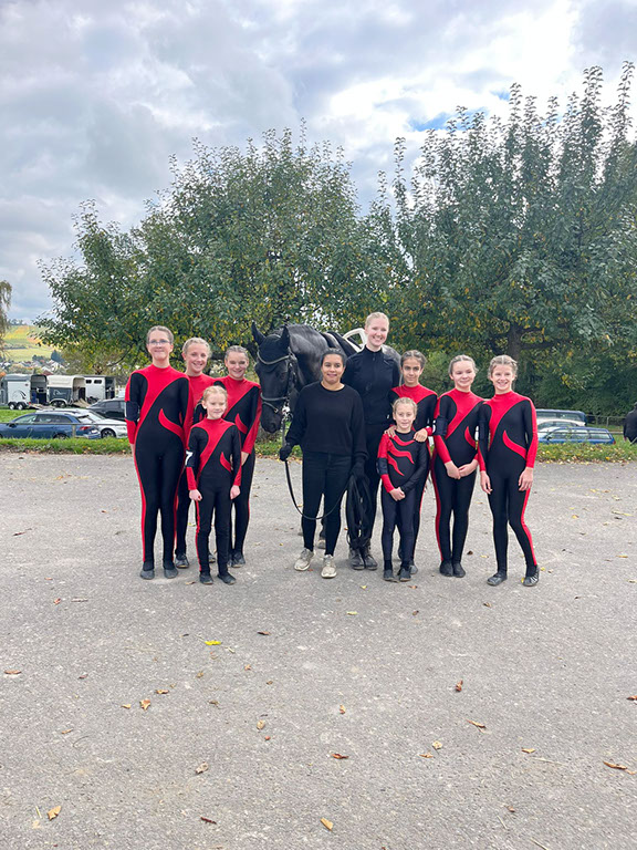 Am Sonntag, 29.09.2024, startete eine der Samstagsgruppen auf dem Voltigierturnier beim Reit- und Fahrverein Wiesloch. Die Voltis, Trainerinnen, Helferinnen und auch Amber, das Pferd, waren mächtig aufgeregt, denn es war eine Premiere. Früh morgens trafen sich alle im Stall, um die Voltis und Amber schick zu machen. Danach ging es los nach Wiesloch. Dort schauten sie zunächst ein bisschen den anderen Startern zu, bevor es ans Aufwärmen und Ablongieren ging. Anschließend ging es auch schon los. Die Einlaufmusik ertönte und Amber, die Voltis und ihre Trainerinnen liefen in den Wettkampfzirkel ein. Sie starteten in einem Schritt- Schrittwettbewerb, d.h., dass die Pflicht sowie die Kür im Schritt geturnt wurden. Zunächst hat jede Voltigiererin ihre Pflichtübungen präsentiert, bevor die Kür, bestehend aus Doppelübungen, gezeigt wurde. Alle Voltis und auch Amber haben ihr Bestes gezeigt und wurden für ihre tolle Leistung mit dem dritten Platz belohnt.